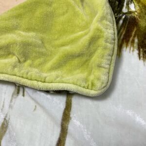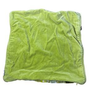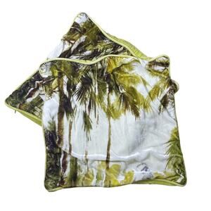 Set of two silk blend velour pillow covers by Arhaus. These green and white shams have a palm tree print on the front, a solid green back, and a zipper closure. They are a viscose and silk blend front with a 100% cotton piping and back.