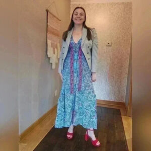 NFC by Aria Moda cover up / dress. This mostly blue bohemian pattern has a mix of bright colors and paisley designs. A Bindu versatile dress in an elegant silhouette, featuring a plunging neckline framed by a border trim. It has ruching at the waistline and a full-length skirt. It has a v-neck and tightens at the bust with strings and tassels. Has short flutter sleeves. For reference, I usually wear a size 10, 5 foot 6". A must-have of the season, great for a festival, spring break, or summer! This is a one size garment. Excellent condition!