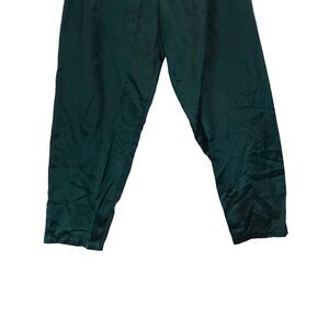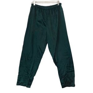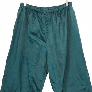 Womens vintage 80s oversized pajama set in a green floral. Pajama top has collar, button front, long sleeves, thicker fabric. Pants are elastic waist in a solid green satin, inside has a warmer lining, not satin against your skin.