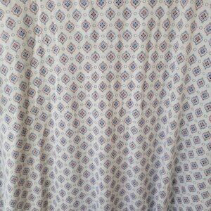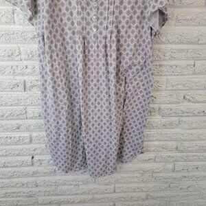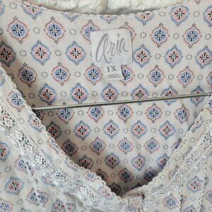 The Aria Women's Nightgown in size 1X Plus is a stylish and comfortable option for lounging. Featuring a blue geometric pattern and lace trim, this short-sleeve gown has a V-neck and 1/4 button closure for easy wear. Made from a blend of cotton materials, this lightweight gown is suitable for all seasons and is machine washable for easy care. Perfect for relaxing in style, this gown by Aria is a great addition to any woman's sleepwear collection.