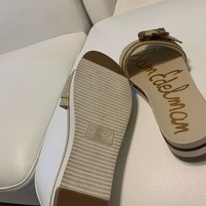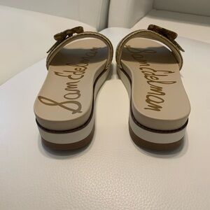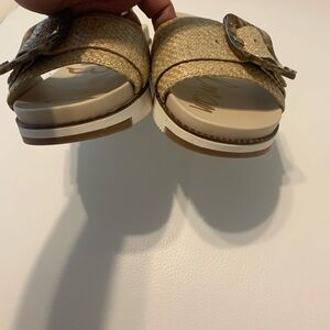 Elegant tan sandals with stylish buckle. Perfect for casual outings. Comfortable and chic design.