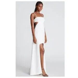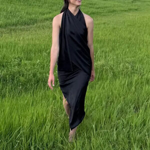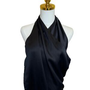 Sophisticated chic bodycon gown in a silky thick satin featuring a draped halter neckline, cut away sleeves asymmetric. side slit , ruched back and artsy draping, can be worn in different ways, Perfect formal, black tie, gala, semi-formal, holiday party, new years, cocktail. flaw see details below