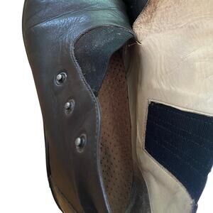 Step out in style with these Ariat "3 Snap Spat" Chelsea ankle booties! Crafted from premium dark brown leather, these boots offer a blend of classic design and modern comfort. The convenient snap closures add a unique touch, while the durable construction ensures long-lasting wear. Slight scuffing on toes area of shoes.  (see last photo)  Some shoe polish would probably help if wanted.  Pre-Owned, Good Condition!