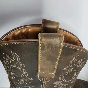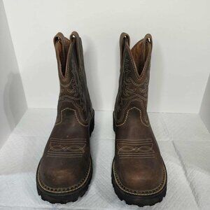 Ariat 7.5B Round toe Western work Boots. Used but still have tons of life left in them. Very comfortable with some scuffs and wear, all shown in photos. Bottom of shoes may have some dirt on them from use but I have cleaned them to best of my ability. Photos show, what you should receive.