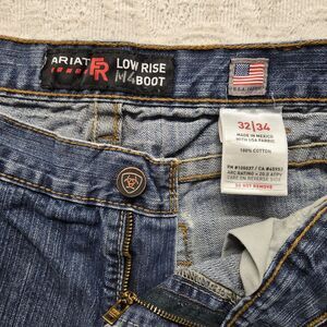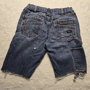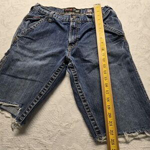 Ariat blue jean cargo shorts in a men's 32. Low rise, cargo shorts with lots of pockets for storage, frayed and distressed hems, and faded front.