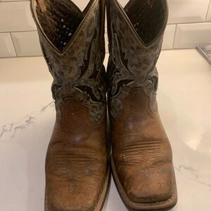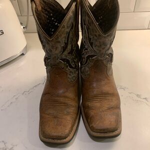 Stylish Ariat boots for kids. Brown leather with intricate design. Perfect for any occasion.