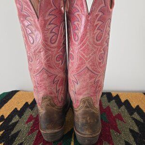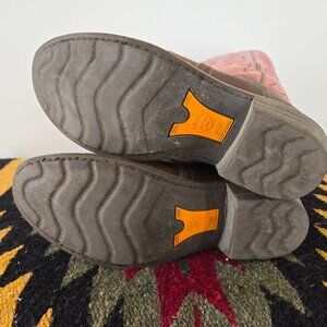 Ariat Buckaroo Boots Women Size 9B (true to size) Pink Leather Tall Western Embroidered Cowgirl Round Toe Pull On #14102. Extremely comfortable, good support & gently worn.