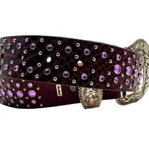 Bring a little Western glam to your wardrobe with this gorgeous Ariat Burgundy Leather Belt. Crafted in a striking reptile-embossed burgundy leather and accented with sparkling lavender crystals, this belt is the perfect mix of rugged and stylish.