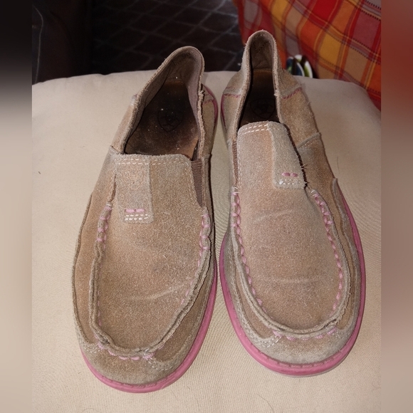 Ariat Cruiser Girl's 13.5 beige suede upper Slip on Loafer Boat shoes Pink Trim