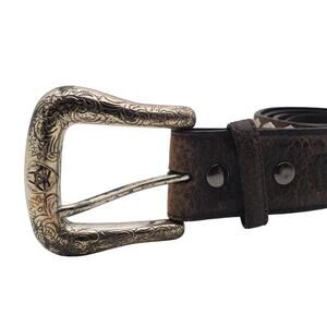 Beautiful leather belt from Ariat. The dark brown leather belt has silver tone diamond shape & studs with a floral buckle.