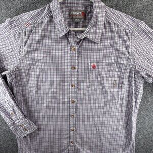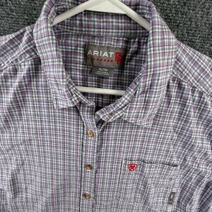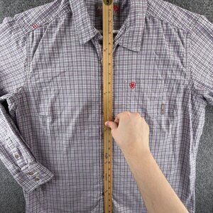 Ariat FR Women Button Up Shirt Purple Plaid Chest Pocket Logo Flame Resistant