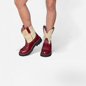 Ariat Fatbaby Red Gator Print/Sand women's boots in size 7B. Mid-calf boots feature a round toe, pull-on closure, low block heel for comfort. The red gator print and sand color gives a cowgirl western theme to the boots. Made of leather with cushioned insoles. Boots in very good shape. Gently worn with just slight wear on heels and one scuff on right front toe. Scuff is shown in last photo. Satisfaction or money back upon return.