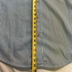 The Ariat Flame Resistant FR Shirt is a men's button-up shirt in size XL, featuring a blue striped pattern and a collared neckline. Made of cotton with a woven fabric type, this shirt is suitable for various occasions including workwear and casual wear. With a regular fit and long sleeves, it offers comfort and style for the modern man. The spread collar and button accents add a touch of classic western and American flair, making it a versatile piece for any wardrobe.