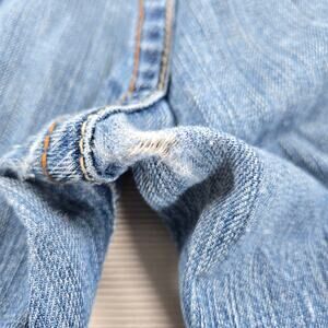 Pre Loved fair condition. Small holes noted throughout the item. Normal wear. Wearing on the back of one of the legs.