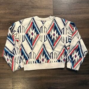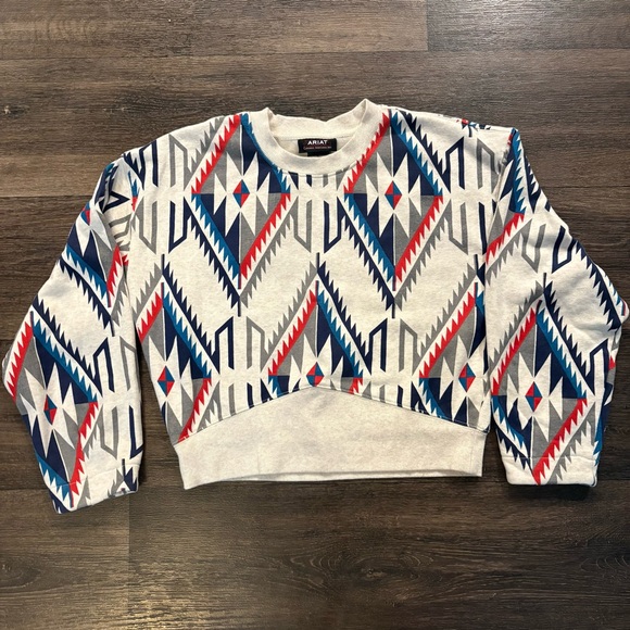 Stylish Ariat sweatshirt with a bold geometric pattern. Features red, blue, and gray colors. Cropped style. Size medium. Worn twice, no signs of wear.