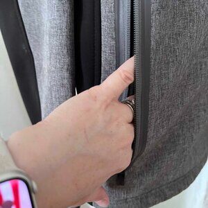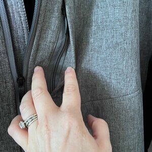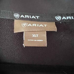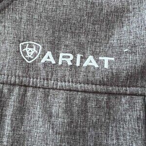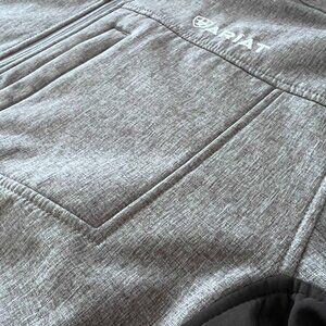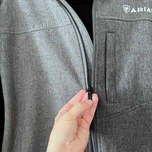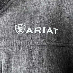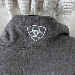 Stylish Ariat jacket. Features gray body with black accents. Full zip front. Ideal for casual wear.