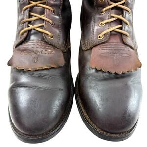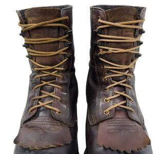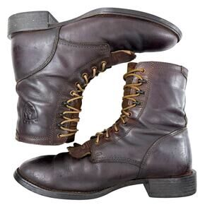 Ariat Heritage Lacer Kilte Roper Boot Men’s Size 9.5 EE WIDE Lace-Up Brown Leather Packer in Good pre-owned condition. Light wear on the upper and sole. Light marks on the removable / replaceable footbed. There are marks, scratches, scuffs and creases from use. One of the laces has some fraying.