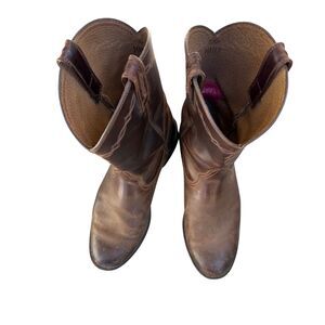 These boots have a naturally distressed patina that enhances their rugged appeal — perfect for work, riding, or casual western wear.