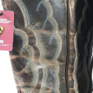 Ariat leather boots are perfect for anyone looking for a stylish and comfortable addition to her wardrobe. They are a light brown color with blue/ white embroidered stitching accents. They have a southwestern pattern and a low block heel. The almond toe shape and pull-on closure make them easy to wear, while the rubber outsole provides waterproofing and grip.
