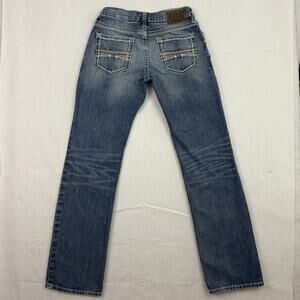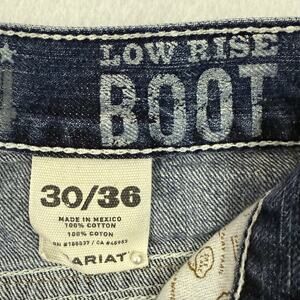 These Ariat Low Rise Bootcut Jeans in size 30x36 are a durable and stylish choice for western wear and everyday comfort. Made from 100% cotton denim, they feature a medium wash with natural fading, whiskering, and contrast stitching for a rugged look. The bootcut fit is designed to pair perfectly with boots, while the low rise waist provides a modern silhouette. Back pockets include signature Ariat trim detail, adding extra style. Made in Mexico, these jeans are from the Ariat “Durango” line, known for quality and long-lasting wear. Great for ranch work, riding, or casual nights out. Excellent pre-owned condition with no major flaws.