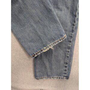 Frayed leg hems and unraveling back-pocket embroidery; some seam wear at crotch/inseam as shown. Button and zipper function properly; tags intact.