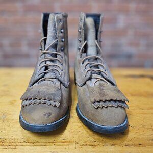 Vintage brown leather lace up roper style ankle boots by Ariat. Removable kiltie fringe at the toe. Fabric lining. Non-slip rubber soles.