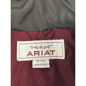 The product is an XL ladies vest by Ariat, featuring an Aztec printed design in brown, blue, and red colors. Made of polyester with a softshell fabric type, this mid-length puffer vest has a full zip closure with a snap button, lined interior, and insulated polyester insulation. It includes side pockets and is suitable for fall and spring seasons. Machine washable and designed for travel, casual, or workwear occasions, this stylish vest also boasts quilted accents and a regular fit for a comfortable wear.
