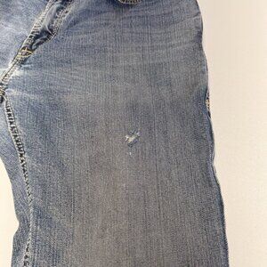 Visible wear. Distressed. Holes in thigh, knee & hem. Faded & stained.