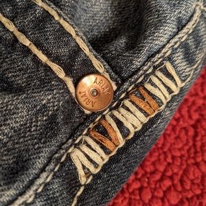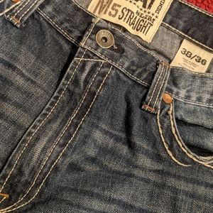 An Ariat best seller and currently unavailable, these jeans are durable and stylish! They have low waist and are cut slimmer through the seat and thigh. They are a medium wash blue with deep front pockets. These jeans are in EXTREMELY good used condition. No stains, signs of wear or pulls. They are 38" waist with a 36" inseam.