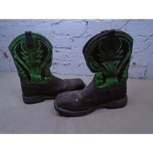 The Ariat Men's 13D Rebar Flex Western VentTEK Brown Green Composite Toe Work Boots are a rugged and stylish pair of boots perfect for various occasions such as activewear, casual outings, and workwear. These mid-calf boots feature a square toe shape, pull-on closure, and a durable rubber outsole for slip resistance. The boots are crafted with high-quality leather and synthetic lining material, offering cushioned comfort for all-day wear. The brown and green color combination, along with the Western style and cowboy theme, make these boots a versatile and eye-catching choice for men.