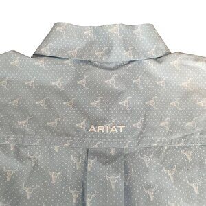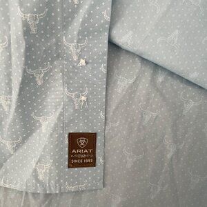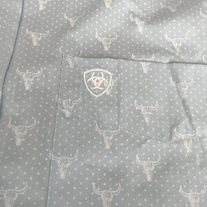 This Ariat shirt features a unique bull print in light blue, offering a stylish yet subtle pattern. Ideal for casual or semi-formal settings, it combines comfort with a classic design.