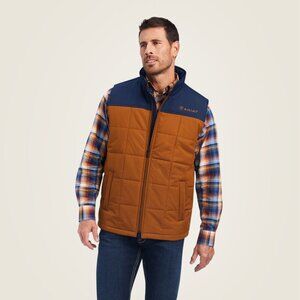 Ariat men's quilted vest in tan and navy. Ideal for layering and comfort.