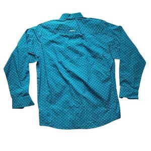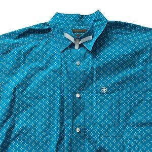 Keywords: Ariat, men's shirt, blue, geometric pattern, button-up, long sleeve, casual, classic fit, embroidered logo, fall fashion, pre-owned.