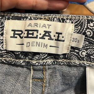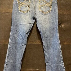 These Ariat boot cut jeans in a classic blue hue feature a natural fading and whiskering effect, offering a stylish and worn-in look. The boot cut design provides a comfortable fit, perfect for casual outings. Crafted with quality denim, these jeans showcase a timeless appeal.