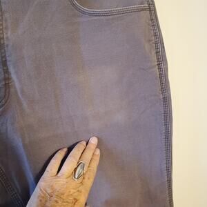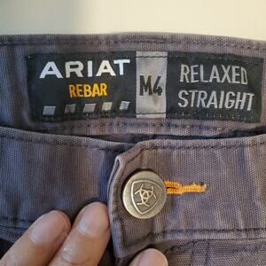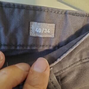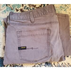 Slight fade on pocket. Measures 32 in length. Otherwise good clean condition. The product is a pair of Ariat men's pants in size 40x34, featuring a solid gray color and made from cotton canvas fabric. These pants have a relaxed fit with a straight leg style, suitable for workwear outdoor occasions. The design includes a zip closure, flat front, and pockets for added functionality. The mid-rise waist is 36 inches, making them a comfortable and practical choice for men seeking durable and stylish workwear pants.