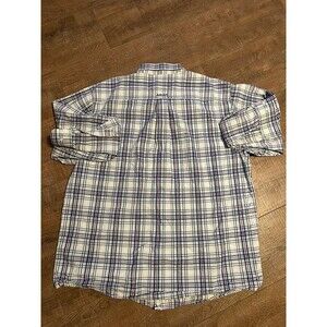 This Ariat Pro Series shirt for men features a colorful plaid pattern in blue, white, and red. The long sleeve shirt is made of a comfortable cotton blend material with a woven fabric type. It has a button-down collar style and button closure. The shirt is size XL and falls under the category of casual button-down shirts. The brand, Ariat, is known for its quality products and this shirt is no exception. It is perfect for any casual occasion and can easily be dressed up or down. * has a name on the inside tag