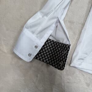 The Ariat Pro Series Equestrian Sunstopper White 1/4 Zip LS Shirt in size Large is a high-quality and stylish piece of clothing designed specifically for equestrian enthusiasts. Made by the trusted brand Ariat, this shirt is manufactured in China to ensure durability and reliability. With its 1/4 zip design and long sleeves, it provides both comfort and protection for riders, making it a practical and fashionable choice for outdoor sports like equestrian activities.