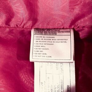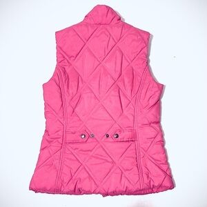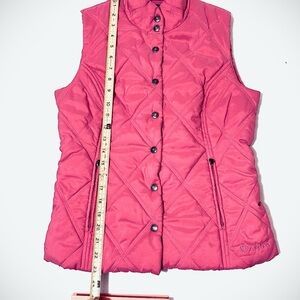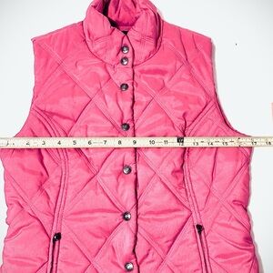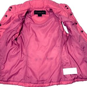 Ariat Puffer Vest, Size S/P (See approximate measurements in photos), Pink. 2 Zippered pockets on front. Snap front closure. Cute martingale adjustment on back. Very Good Condition. 849