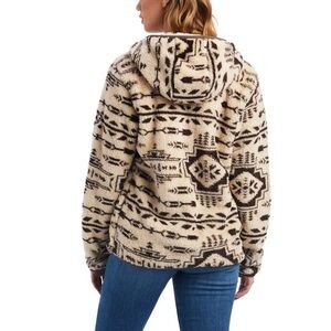 Stay cozy in this Ariat R.E.A.L. pullover hoodie featuring an Aztec-inspired pattern in warm cream and chocolate tones. With ultra-soft sherpa fleece, a 1/4 zip front, kangaroo pocket, and hooded design, it's perfect for chilly days or layering under a vest.