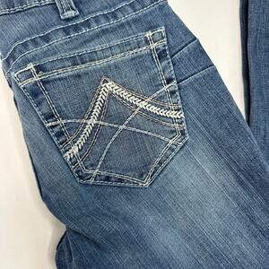 Ariat REAL Denim Straight Leg Low Rise Jeans. Zip fly. Five pocket styling. Medium wash denim. 92% cotton/6% polyester /2% spandex. Womens size 25R