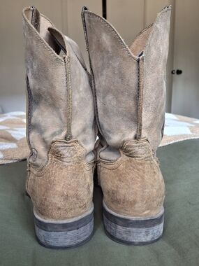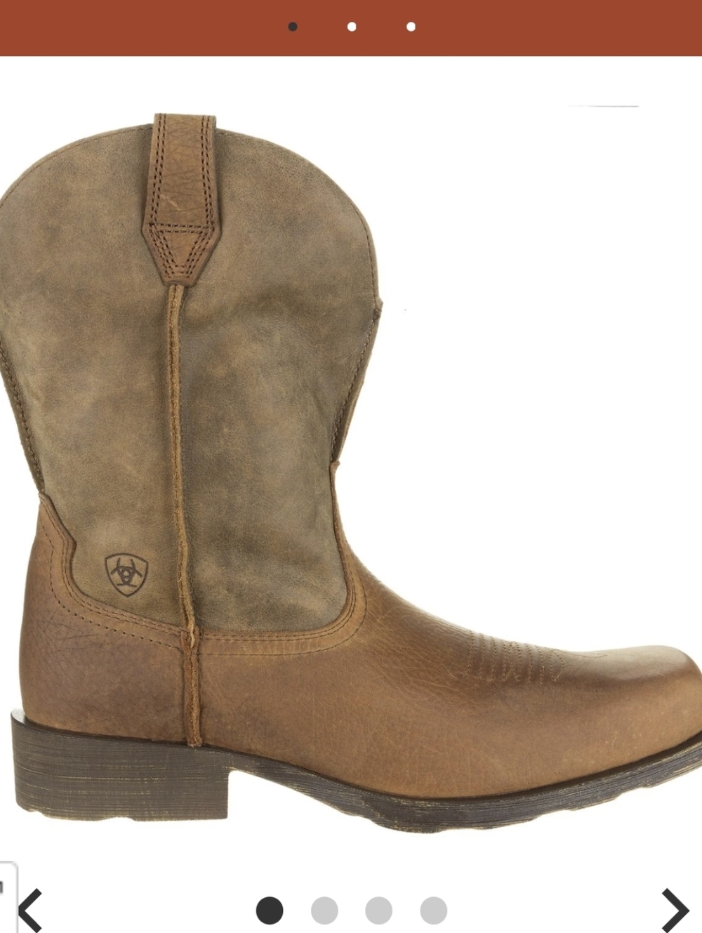 Classic Ariat western boots with a worn leather finish. Sturdy sole and reinforced heel. Easy pull-on for quick wear. Timeless western silhouette suitable for casual or work use.