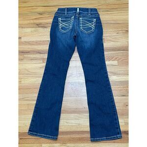 The product is a pair of Ariat Real Women's Blue Jeans in size 26. These denim cotton bootcut mid-rise jeans feature a faded grunge design, making them a stylish and comfortable choice for women. With a button closure, solid blue color, and regular fit, these jeans offer both fashion and functionality. Pockets and easy care features add practicality to the overall design, making them a versatile addition to any wardrobe. The Ariat brand is known for quality and durability, ensuring that these jeans will last for years to come.