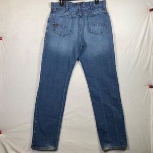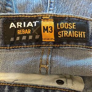 Brand: AriatStyle: Rebar Loose StraightSize: 32Fit: LooseLeg Style: StraightColor: BlueMaterial: Cotton Blend Closure: Zip Fly with ButtonFeatures: Durable, Workwear, Reinforced PocketsCondition: Pre-owned, good condition, back cuff on both legs has some wear.Ariat Rebar Loose Straight Jeans, men’s size 32. Classic medium blue wash with durable denim construction designed for workwear and everyday comfort. Loose fit through seat and thigh with straight leg. Features multiple pockets including tool/utility pocket. Pre-owned, overall good condition with normal wear. Measures approximately waist 32", inseam 33.5", rise 11".