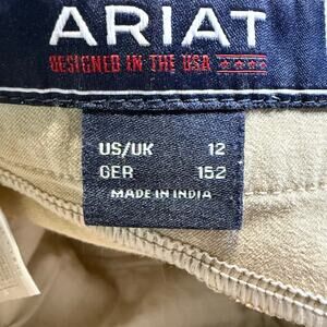 Ariat Riding Jodhpurs, Knee Patch Equestrian Breeches With Foot Straps, Girls Size 12. Classic girls equestrian riding jodhpurs in tan with reinforced knee patches and elastic under foot straps to keep pant legs in place while riding. Ideal for training rides, lessons and schooling. Hook and zip closure, reinforced suede knee patches, elastic foot straps. Good condition. #Equestrian #RidingPants #HorsebackRiding