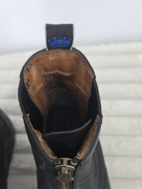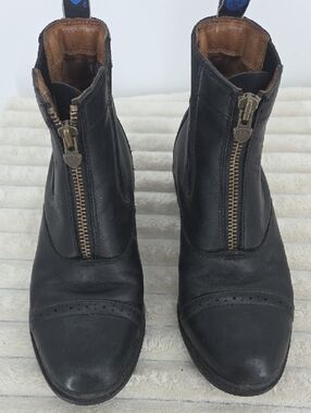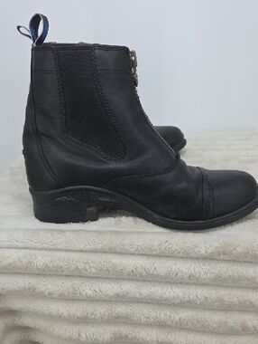 Smooth black leather upper with front zipper entry. Low stacked heel for everyday wear. Elastic side panels for a snug fit. Pull tabs at the back for easy on and off.