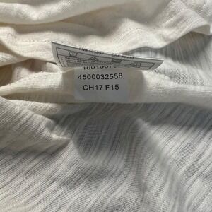 Body of shirt is cream in color with teal and copper design and copper colored sleeves.