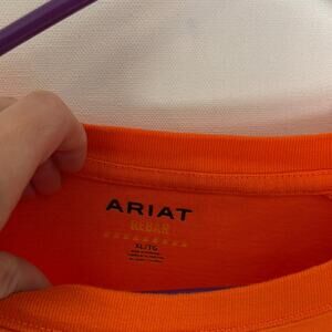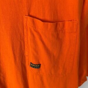 Gently Used Ariat Rebar Short Sleeve Pocket T-Shirt. This is a men's XL. Bright orange throughout. Ariat text logo tag on the pocket. 100% cotton.