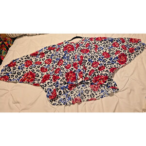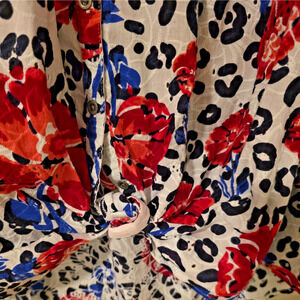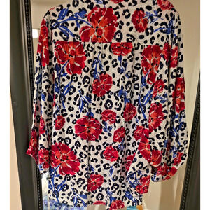 The Ariat Top for women in size Large features a red, white, and blue floral pattern with eyelet details, perfect for a festival or western-themed occasion. Made of 100% cotton, this blouse has long relaxed sleeves, a crew neckline, and a pullover closure for easy wear. With a relaxed fit and lightweight fabric, it is suitable for various occasions from casual to business, making it a versatile addition to any wardrobe. The eyelet design adds a touch of elegance to this basic yet stylish top from the reputable Ariat brand.