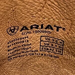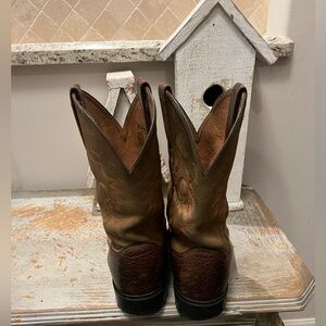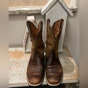 Rugged Ariat boots with a two-tone design. Crafted for style and comfort. Ideal for any cowboy look. Used condition. Some discoloration on body of boots from wear. Some knicks and scuffs on toes. See pictures.