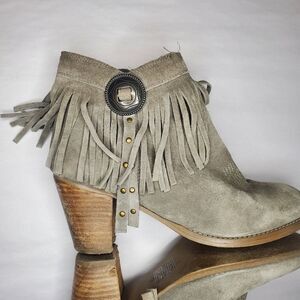 -Details: Step out in style in a fringed short bootie with concho and metal detailing.